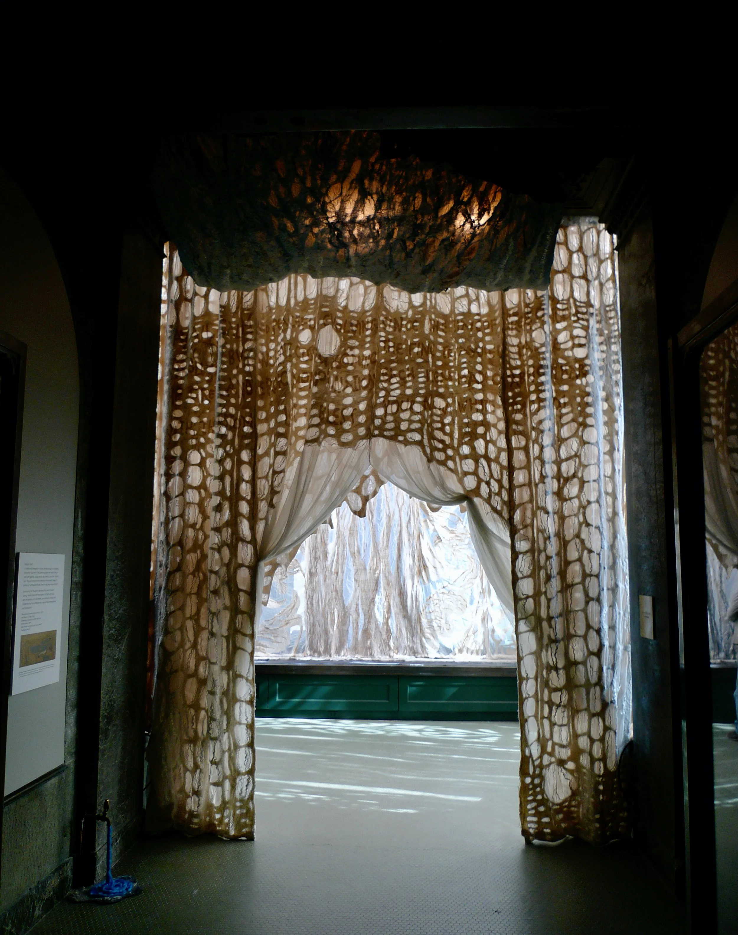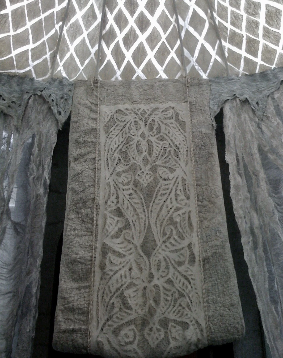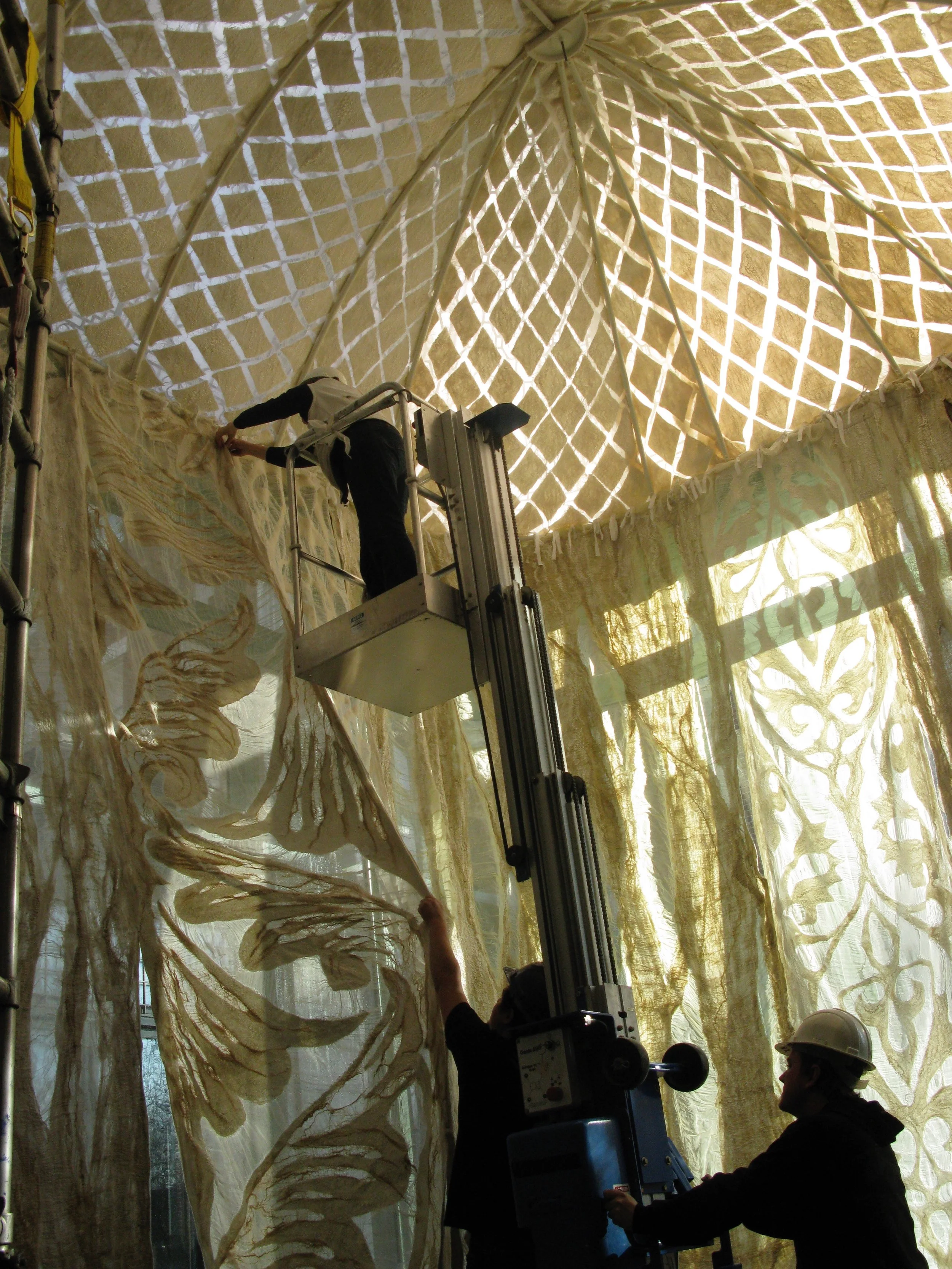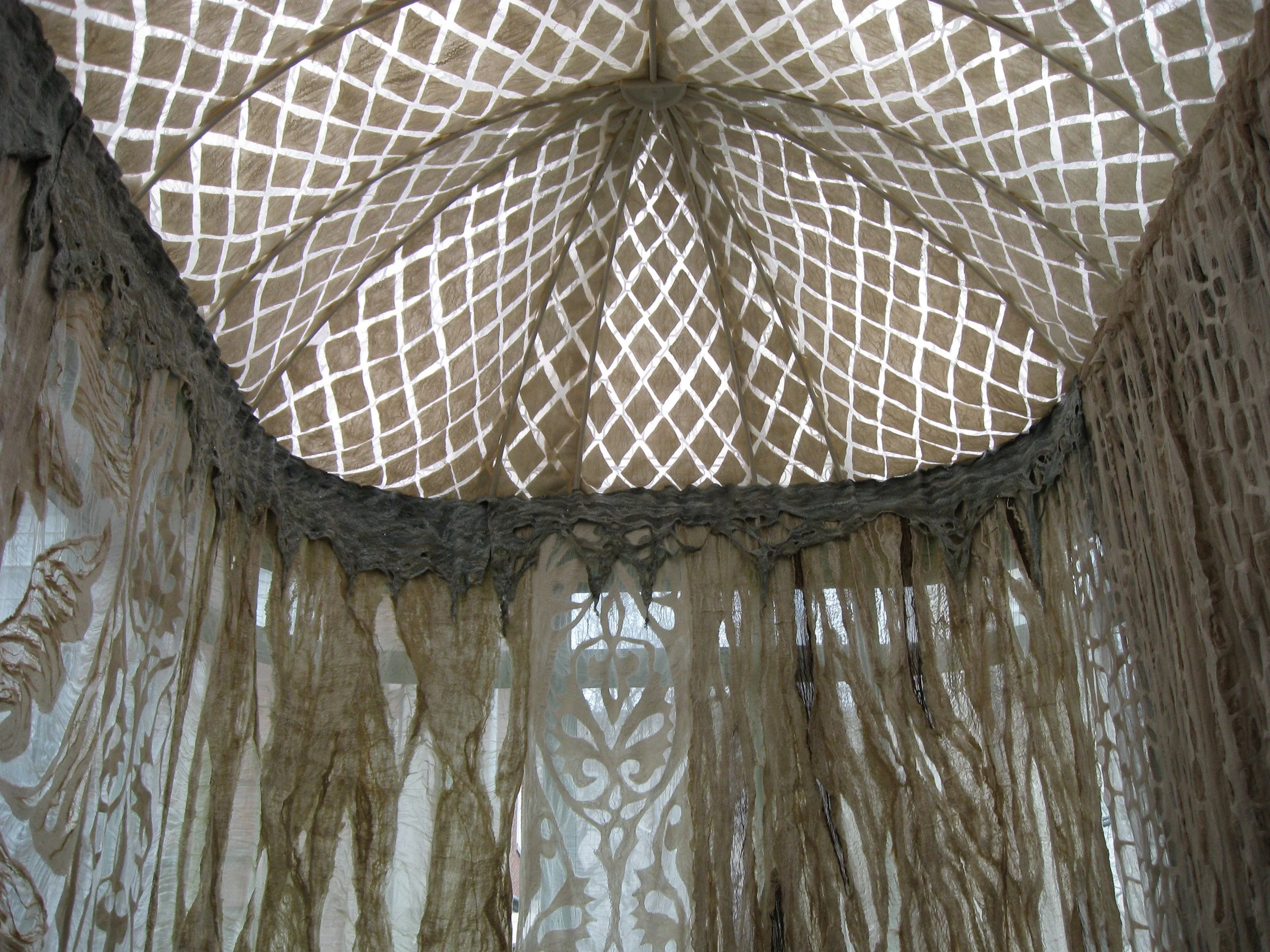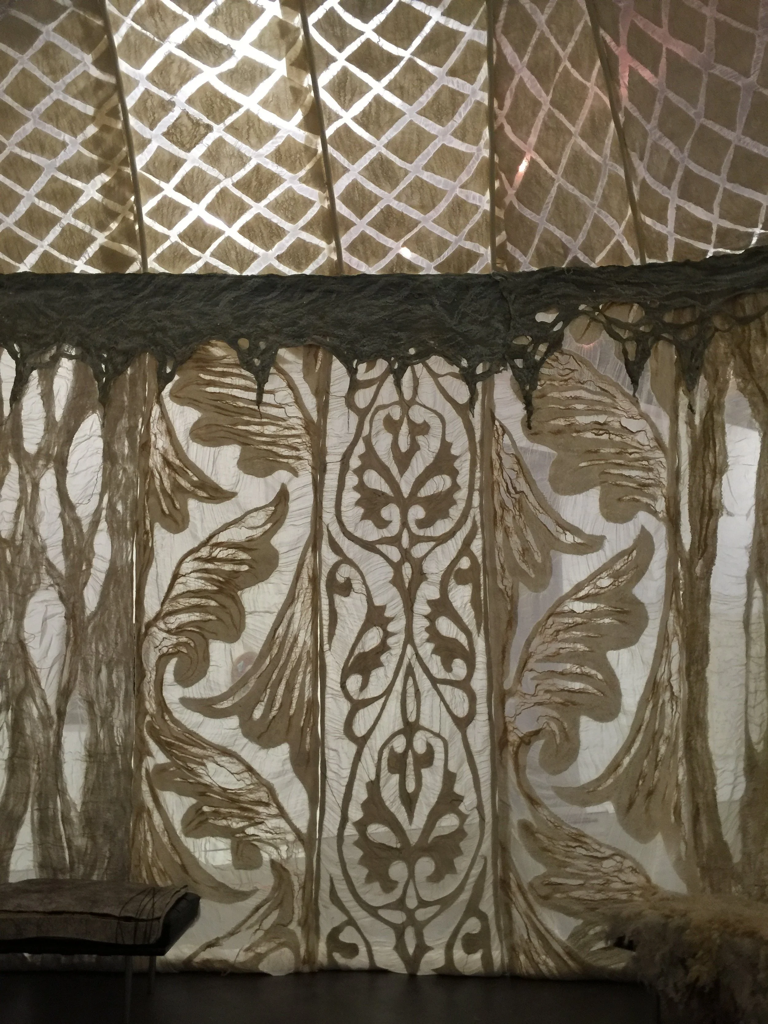 The Conservatory, quite literally a very grand Glass House within the Carnegie Mansion, shares many architectural details in form and style with the Palace Yurt. It seemed only fitting that the Fashioning FELT exhibition demonstrate the link between the historical origins of Felt and contemporary Felt art through the symbolism of the Palace Yurt, thus synthesizing the past with the present. Arnold proposed lining the space with handmade Felt she specifically designed and created as an immersive experience to honor the origins and demonstrate the dramatic range of textures, densities and thicknesses this art form can achieve.