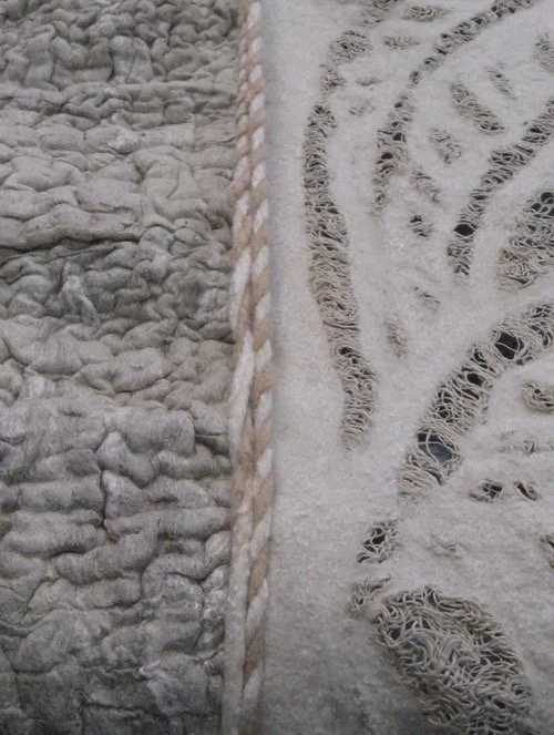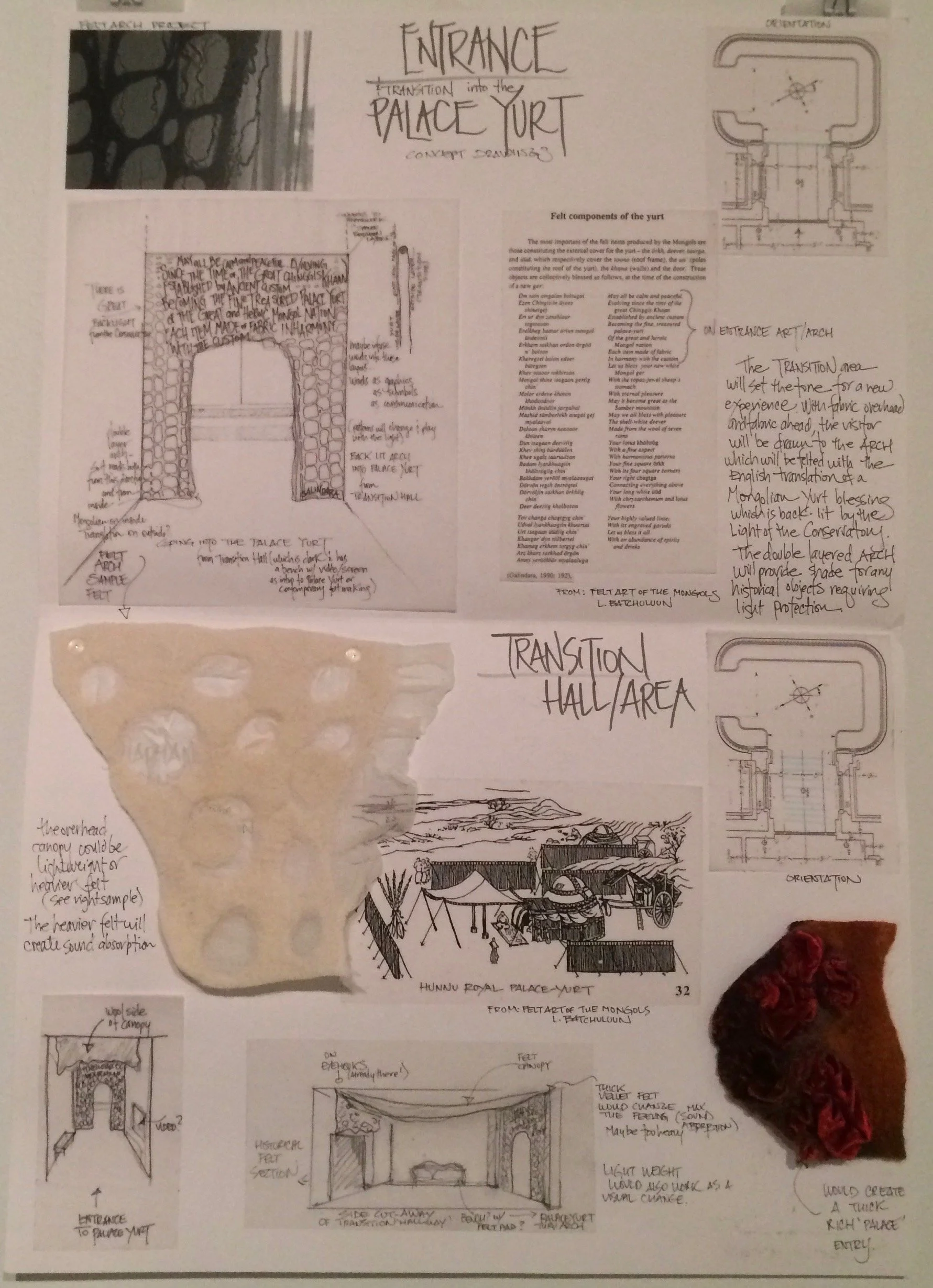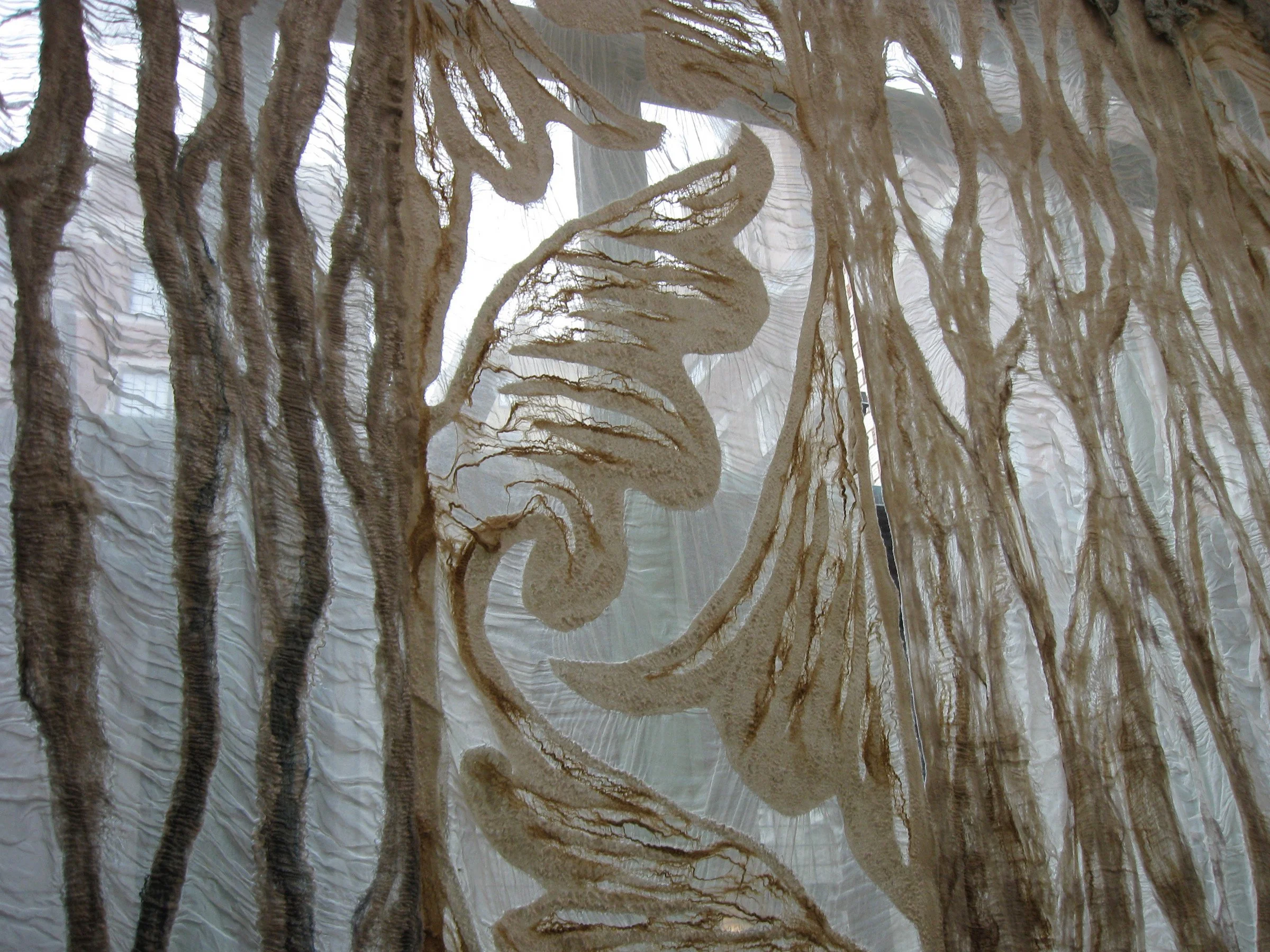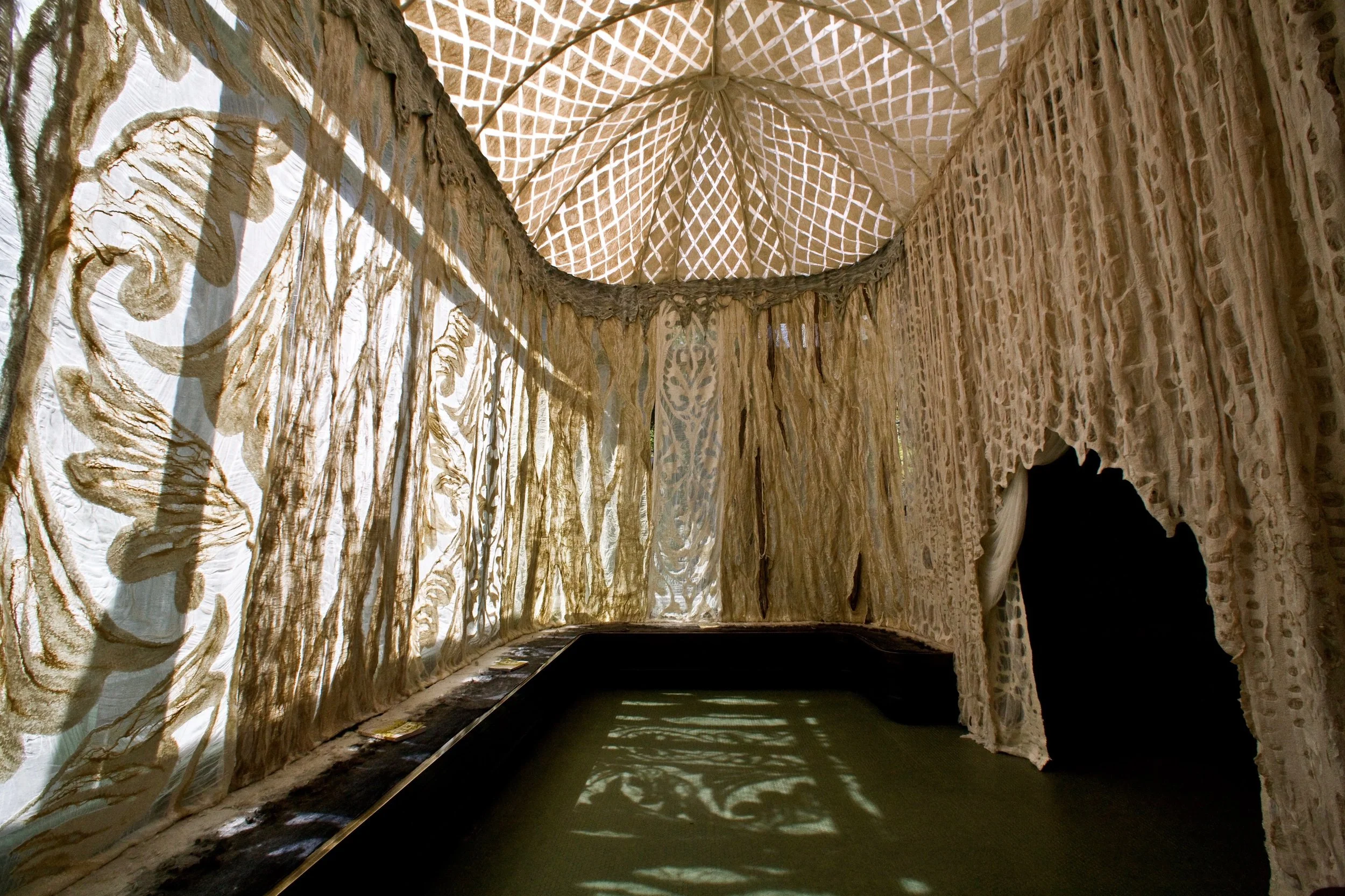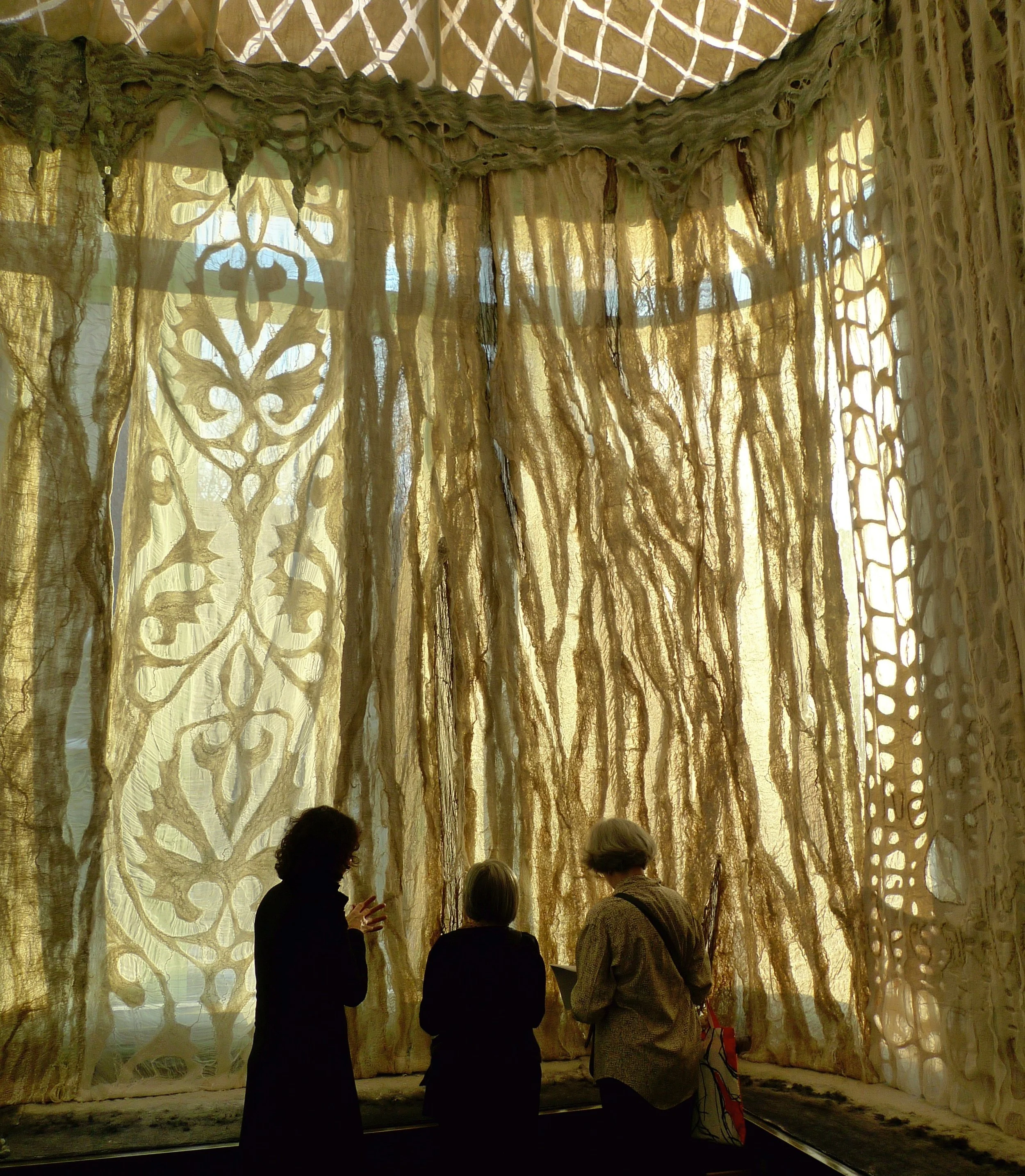 The Conservatory, quite literally a very grand Glass House within the Carnegie Mansion, shares many architectural details in form and style with the Palace Yurt. It seemed only fitting that the Fashioning FELT exhibition demonstrate the link between the historical origins of Felt and contemporary Felt art through the symbolism of the Palace Yurt, thus synthesizing the past with the present. Arnold proposed lining the space with handmade Felt she specifically designed and created as an immersive experience to honor the origins and demonstrate the dramatic range of textures, densities and thicknesses this art form can achieve.