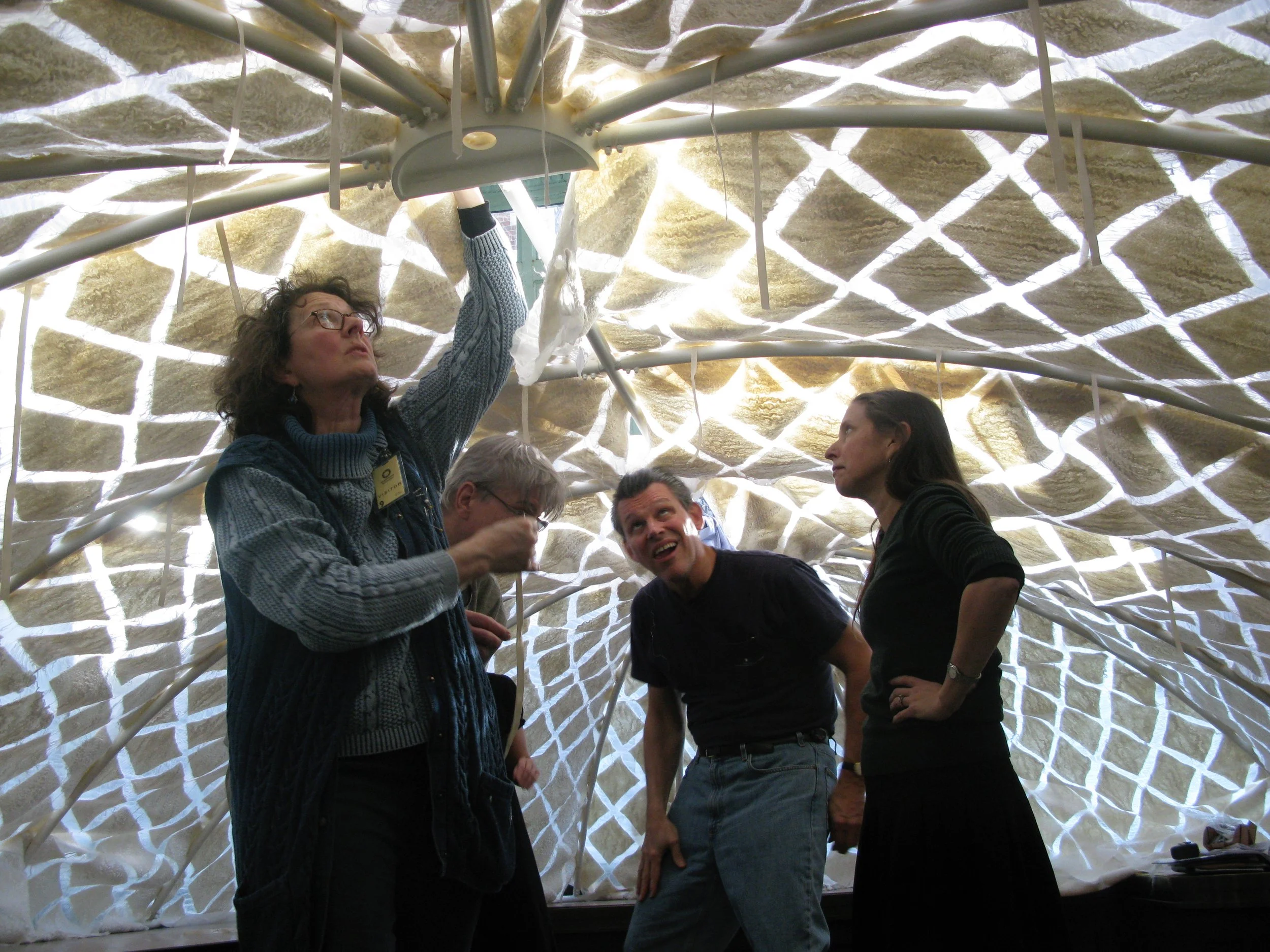 The yurt, a tent-like, collapsible dwelling covered with Felt, has been home to generations of Turkic-Mongolian tribes for thousands of years. During research trips to Central Asia and Mongolia, Arnold was inspired by the Indigenous artisans and their methods of making this ancient textile as well as the rituals, culture, and philosophies it embodies. She was also intrigued by tales of Genghis Khan, whose yurts (ger) were used for their portability, allowing the royal court to travel with their leaders on military campaigns, and were said to hold over 1000 men.